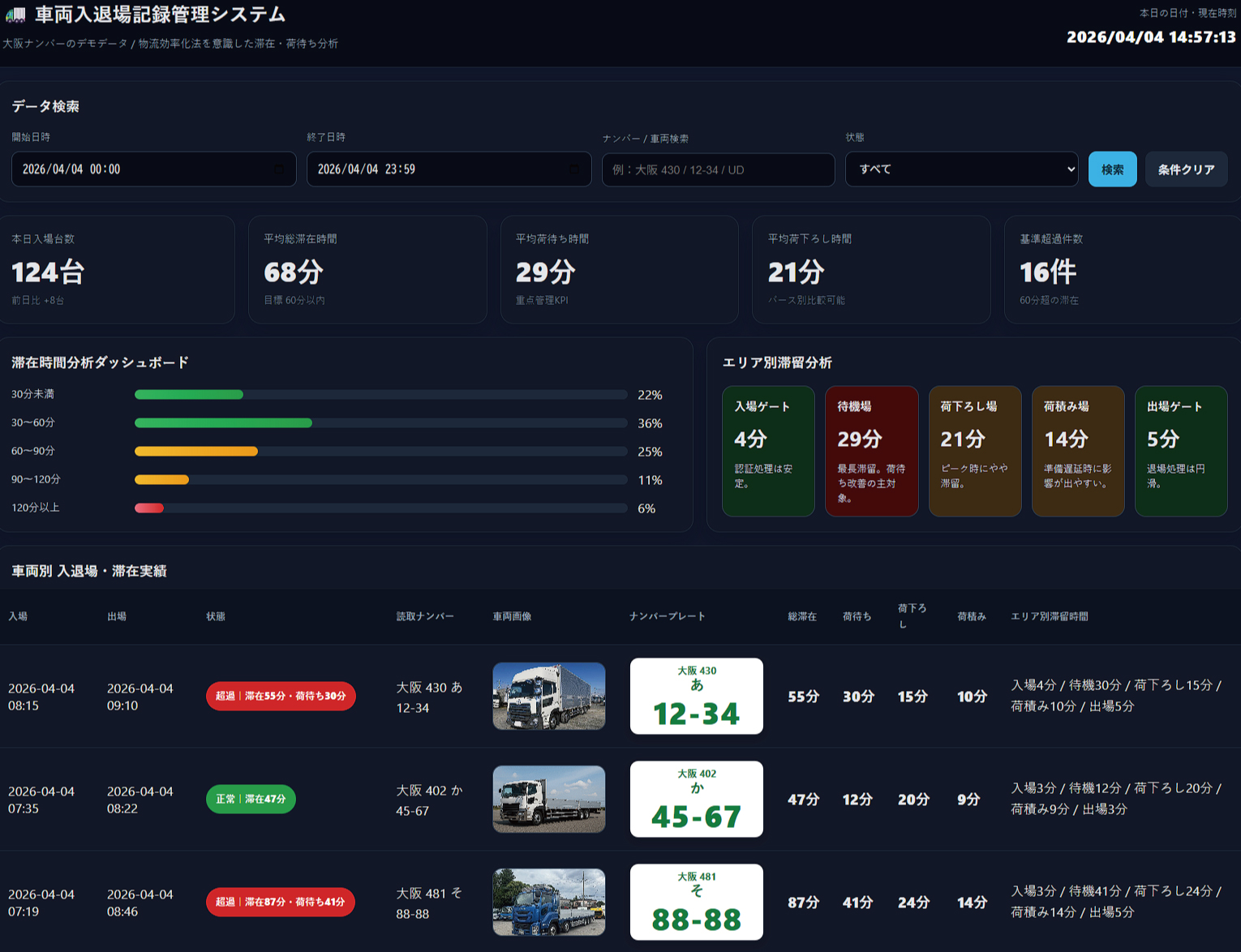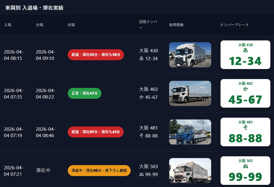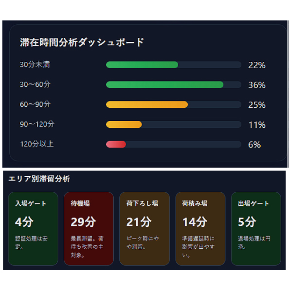 トラックの入場から出庫までの各工程が可視化されておらず、どこでどれだけ待機が発生しているのか把握できていないケースが多くあります。結果として、改善ポイントが不明確なまま運用が続いています。
